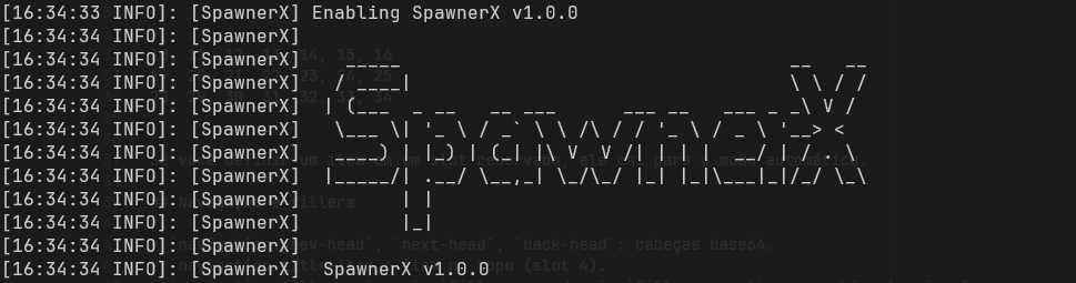 Na primeira inicialização, o plugin cria os arquivos padrão em plugins/SpawnerX/. Ele também registra listeners e habilita o menu de interação, stacking, distância ativa e shop (se habilitado).